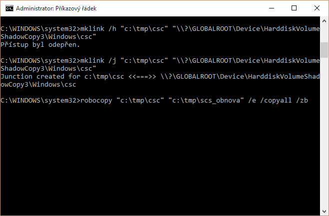 A nakonec potřebná data vykopírujeme pomocí “robocopy "c:\tmp\csc" "c:\tmp\scs_obnova" /e /copyall /zb”.