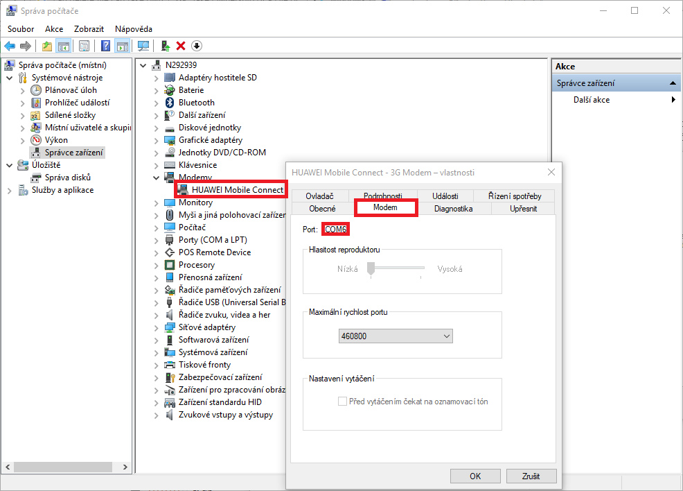 Nejprve modem připojte k počítači, spusťte Správce zařízení – Modemy – HUAWEI Mobile Connect –3G Modem a otevřete kartu Modem. Zapamatujme si, na jakém COM portu je zařízení připojeno.