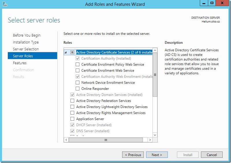 Active Directory by měla mít nainstalovanou certifikační autoritu. Pokud nemá, nainstalujete jí pomocí Server Manager – Add roles and features – Server Roles – Active Directory Certificate Services.